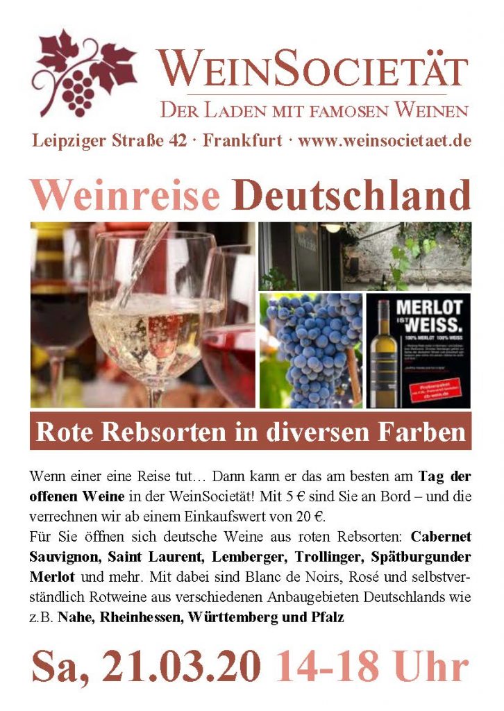 In bewegten Zeiten wie diesen reist es sich am allerbesten, in dem man an einem Ort bleibt: in der WeinSocietät. Am Samstag, 21. März 2020, reisen wir von 14 bis 18 Uhr kreuz und quer durch Deutschland – immer auf den Spuren der Rotwein-Rebsorten: