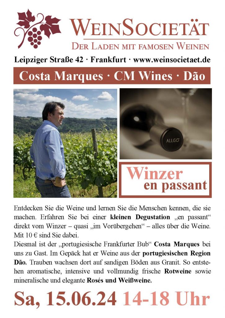 Am Samstag, 15. Juni 2024, von 14-18 Uhr, ist Costa Marques aus Portugal vom Weingut CM Wines aus der Region Dão zu Gast in der WeinSocietät. Im Gepäck hat er unter anderem den „Flor d’Allgo“ tinto – aus den Rebsorten Jaén, Touriga nacional und Trincadeira. Die Cuvée rundet der Tempranillo ab. Auch sein „Bruder“ „Allgo tinto“ reist an, dazu Rosé und frische Weißweine. Was der „portugiesische Frankfurter Bub“ Costa Marques noch kredenzt – das probieren Sie am 15. Juni!