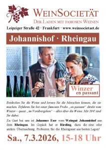 Am Samstag, 7. März 2025, von 15-18 Uhr, ist Johannes Eser vom Weingut Johannishof aus Johannisberg im Rheingau zu Gast in der WeinSocietät. Im Gepäck hat er natürlich Rieslinge. Was er außerdem kredenzt – das probieren Sie am 7. März!