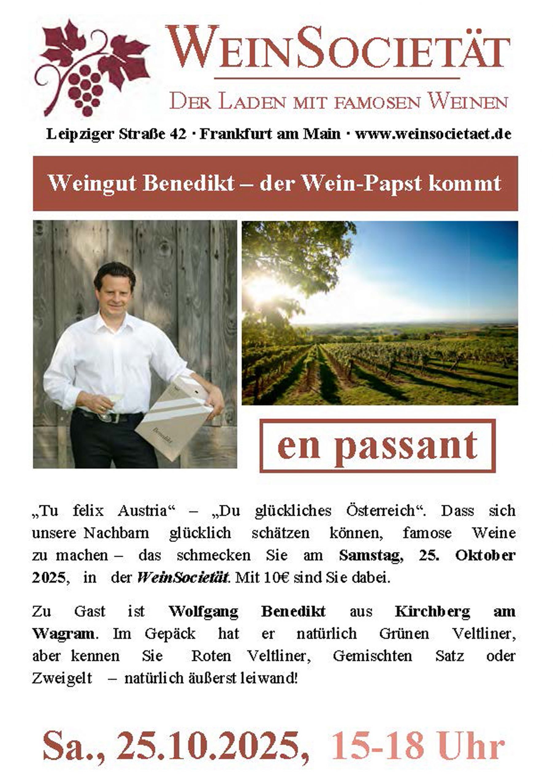 Wolfgang Benedikt ist so etwas wie der Wein-Papst im Wagram, westlich von Wien. Seine Weine gehören seit Jahren in die Stammelf der WeinSocietät. Doch – kaum zu glauben – er war noch nie in Frankfurt, sagt er. Das ändern wir!